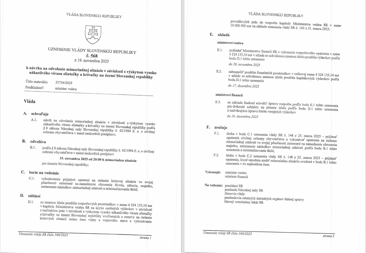 Obec Gemerský Jablonec zverejňuje Uznesenie vlády č. 568/2025 k návrhu na odovolanie mimoriadnej situácie v súvislosti s výskytom vysoko nákazlivého vírusu slintačky a krívačky na území Slovenskej republiky.